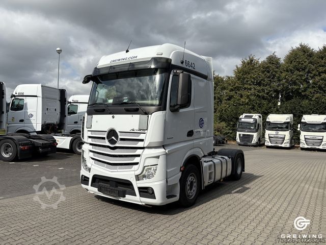 Engine: 330 kW (449 hp), Euro VI, D, 2200 Nm, 2nd generation OM471 engine, high-performance engine brake; automatic transmission G 211-12/14.93-1.0 Mercedes PowerShift 3; ADR/GGVS equipment; PTO; rear axle differential lock; axle ratio i = 2.412; L-cab BigSpace with flat floor; continuous perforated frame; step plate above frame; partial frame overhang cover 1050 mm; main tank left 720 L + 75 L AdBlue; second tank right 430 L, lockable; standard fifth wheel Jost JSK 37C, fifth wheel height H = 150 mm; kingpin offset +600 mm; disc brakes on front and rear axles; electronic braking system with ABS and ASR; emergency brake warning lights; electronic parking brake with acoustic warning; Predictive Powertrain Control; stability control (ESP); lane-keeping assist; distance control assist; attention assist; traffic sign assist; Active Brake Assist 5; cruise control; comfort air-suspended cab mounting; mechanically-hydraulic tilting cab system; tinted windscreen; light and rain sensors; electric sunroof; external storage flaps left and right; toolbox under cab, left side; door extension; ramp mirror and heated front mirror; external transparent sun visor; comfort central locking system; comfort driver's suspension seat; co-driver’s functional seat; velour seat covers; comfort lower bed and narrow upper comfort bed; leather multifunction steering wheel; driver airbag; carpeted engine tunnel; side sun blind at driver’s side; electric windows on both sides; 2nd generation digital tachograph, ADR, VDO manufacturer; On-Board Diagnostics; trip computer; interactive multimedia cockpit; maintenance system; Remote Online; Mercedes-Benz Truck App Portal pre-equipment; sound system; navigation system; Fleetboard Eco Support (Fleetboard Manager App required); Truck Data Center 7 and pre-installation; toll collect pre-equipment; CB radio pre-installation 12 V DIN slot; 24 V/15 A socket; entrance lights in co-driver’s footwell and door trim; ambient lighting; auxiliary hot water heater; residual heat utilization; additional thermal insulation; electric parking air conditioning; automatic climate control; bottle holder; document tray for DIN A4 papers; storage compartment covers on driver/co-driver sides; drawers under the bed; overhead storage flaps above windscreen; fridge drawer under bed; compressed air connection in cab; LED daytime running lights; halogen fog lights; work lights below; side marker lights and LED outline marker lights; flashing side marker lights; Safety Pack; Climate Package; Interior Chrome Package; total tank capacity 1150 L; retarder.